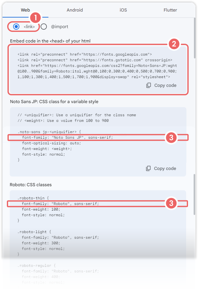 フォントの指定は、セレクタ名{ font-family : "最優先のフォント" , "第2候補" , "第3候補" , … , どれでもないとき(sans-serifなど) ; }となるので、英字フォントと日本語フォント両方とも使いたいときはセレクタ名{ font-family : "英語フォント" , "日本語フォント" , どれでもないとき(sans-serifなど) ; }というように書き換えましょう。※日本語フォントを英語フォントよりも先に読み込んでしまうと、日本語フォント(全角・半角両方対応)が英語フォント(半角のみ対応)より先に読み込まれてしまうため